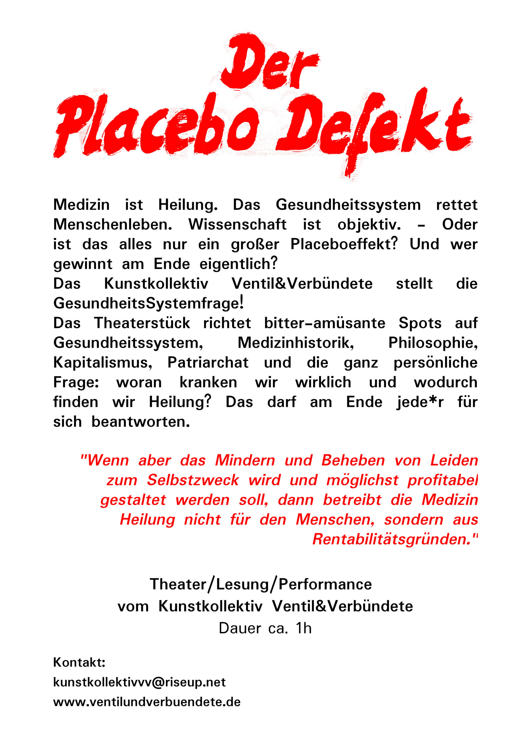 Das Kunstkollektiv Ventil&Verbündete stellt die GesundheitsSystemfrage! Das Theaterstück richtet bitter-amüsante Spots auf Gesundheitssystem, Medizinhistorik, Philosophie, Kapitalismus, Patriarchat und die ganz persönliche Frage: woran kranken wir wirklich und wodurch finden wir Heilung? Das darf am Ende jede*r für sich beantworten.